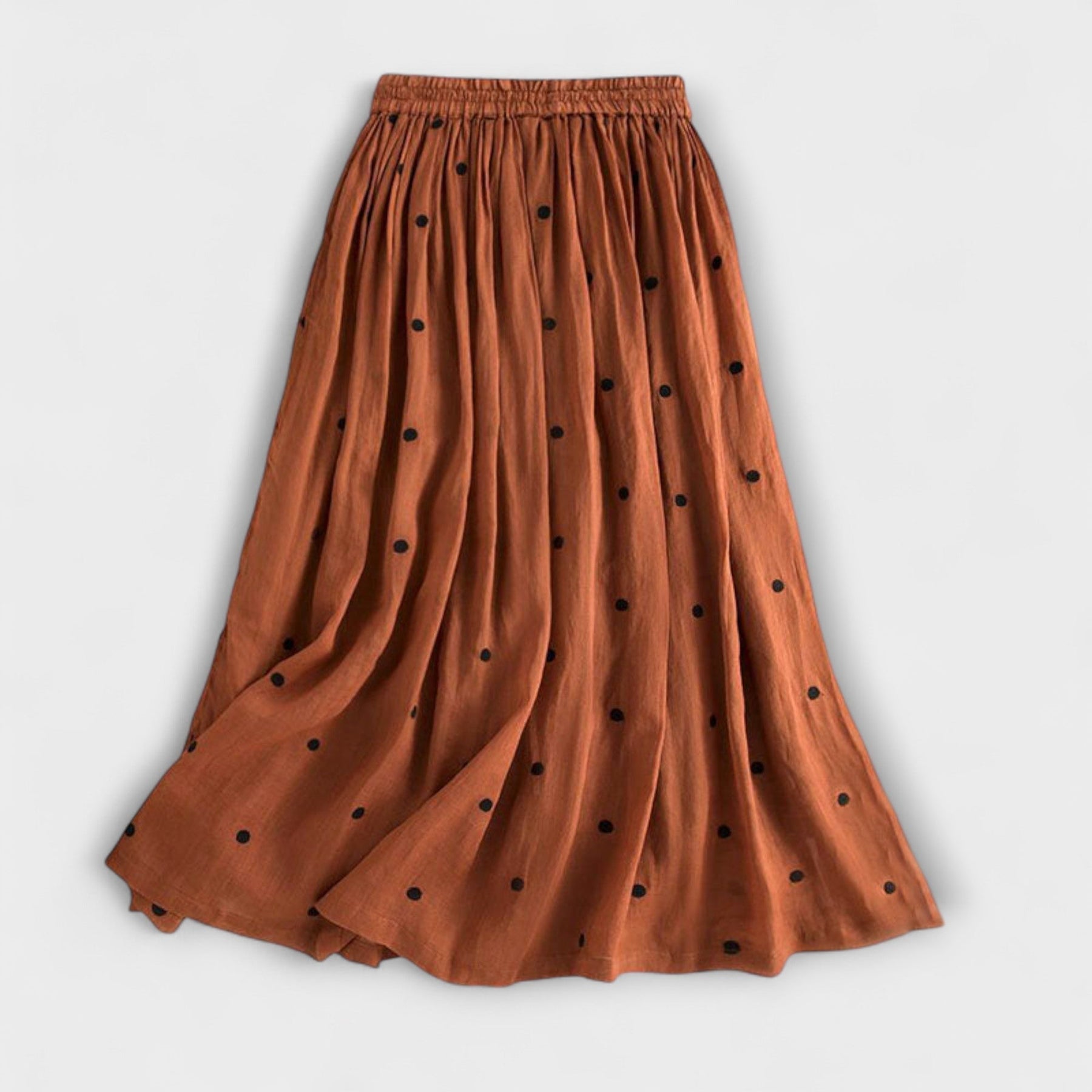 Discover our enchanting maxi skirt featuring a polka dot pattern that combines timeless elegance with natural comfort. Made from a high-quality linen-cotton blend, it impresses with: Soft linen-cotton blend for a pleasant wearing experience Feminine A-line cut for a flattering fit Playful polka dot design with delicate lace Flowing maxi length – ideal for elegant & casual looks Versatile use for everyday, leisure, or special occasions